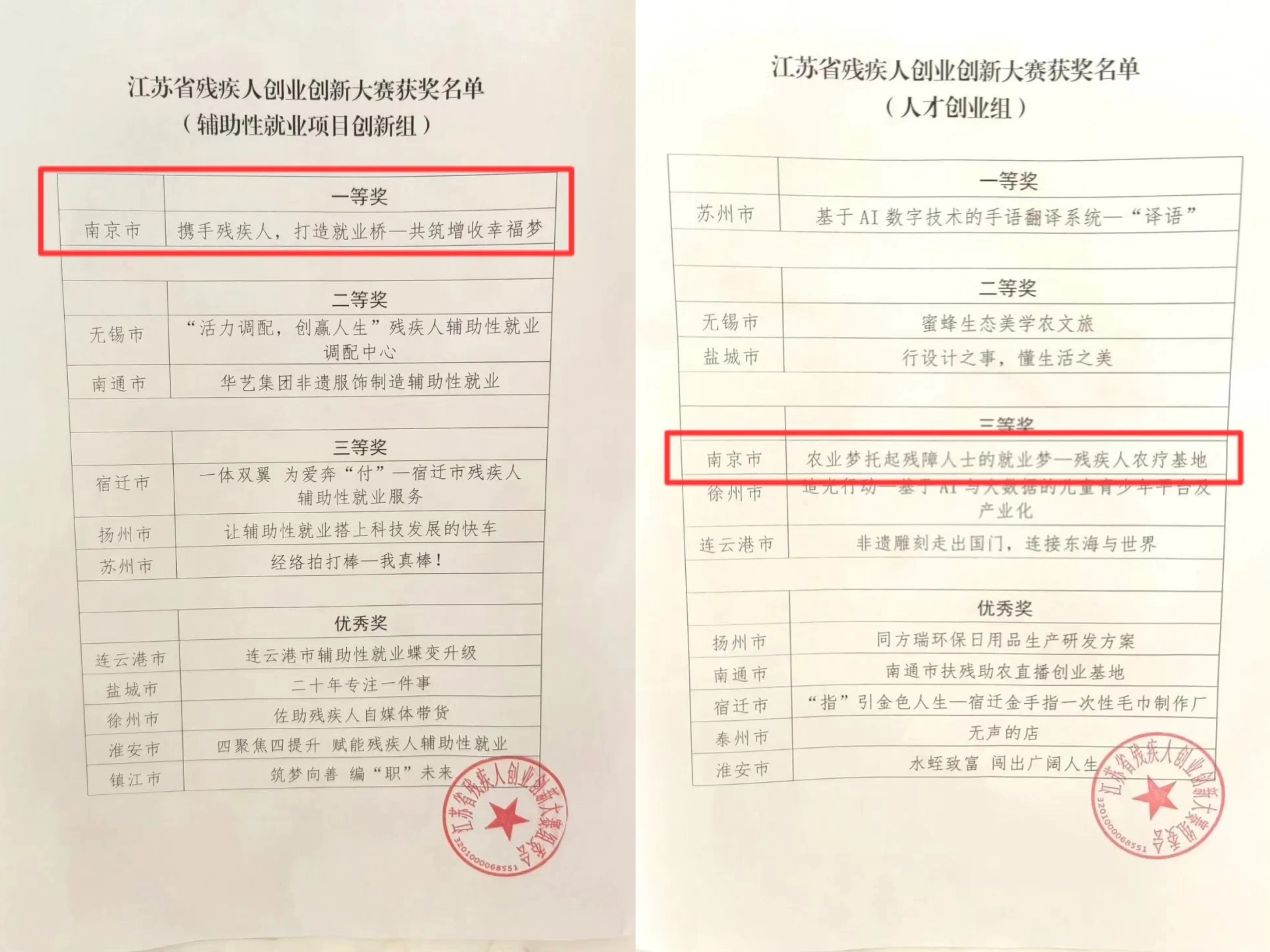 10月14日,江苏省残疾人创业创新大赛在苏州市落下帷幕,南京市2名选手经过激烈争夺,从全省26名选手中脱颖而出,其中朱丽颖的“携手残疾人,打造就业桥——共筑增收幸福梦”获得辅助性就业项目创新组第一名,杨琳琳的“农业梦托起残障人士的就业梦——残疾人农疗基地”获得人才创业组第三名。
