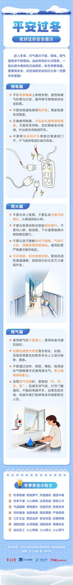 寒冬已至,天气寒冷干燥,用电、用气量需求不断增加。由此带来的火灾隐患、一氧化碳中毒风险日益增多。秋冬季要保暖,更要保安全。为确保残疾人朋友平安温暖过冬,这些消防安全知识大家一定要牢牢掌握!