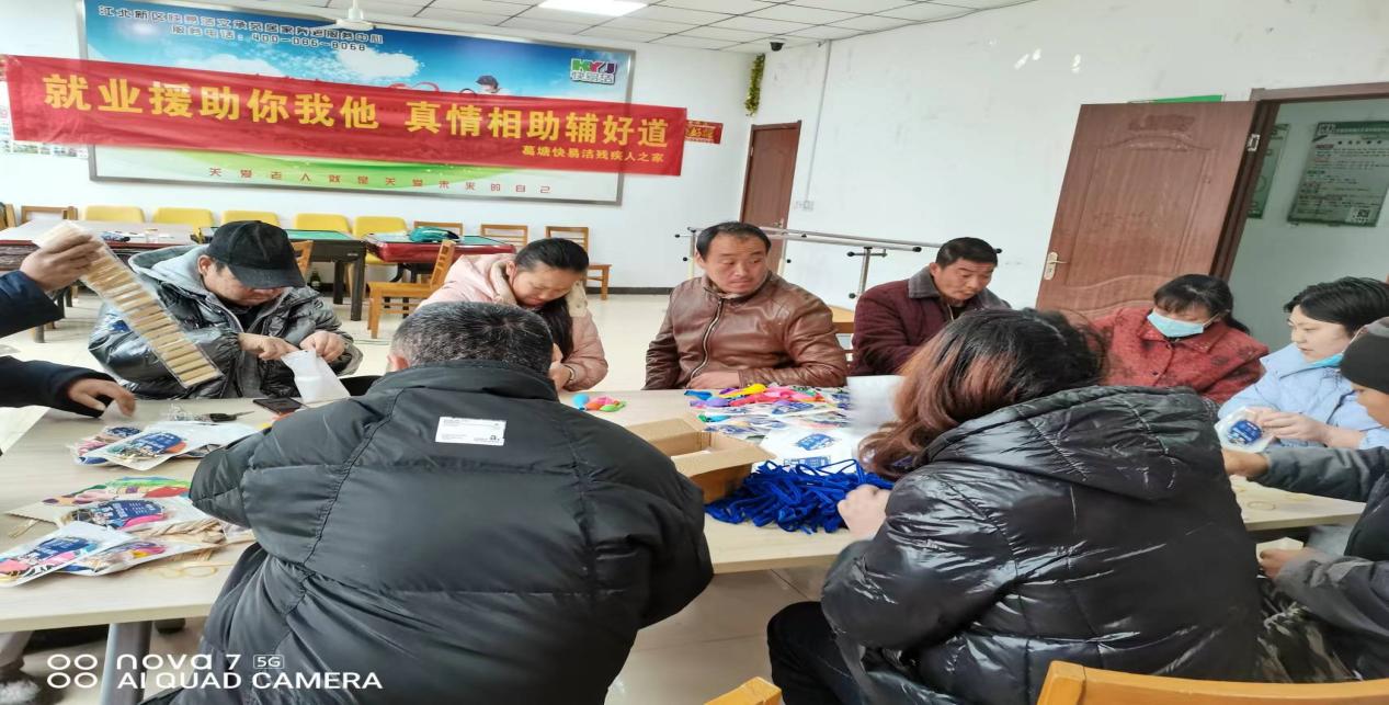 2023年2月22日一大早,江北新区葛塘街道快易洁残疾人之家人声鼎沸,热闹非凡,残障人士齐聚在活动大厅,你挨着我、我挨着你,忙碌着手中的活,现场一片美好。