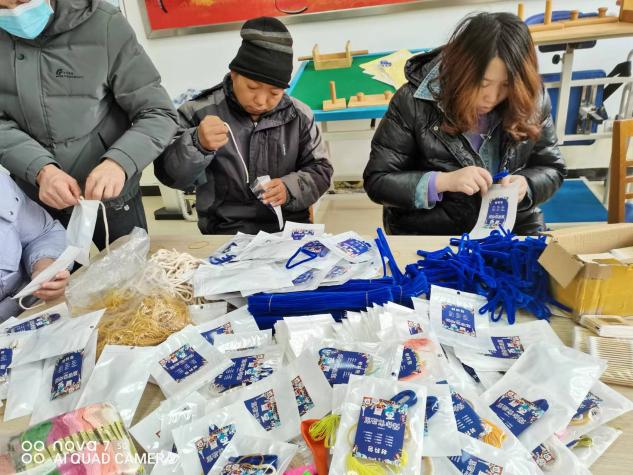 第二天是最后一道工序进行大袋包装,这个要求也是要按顺序进行,操作中由于装袋的东西要核对数量所以慢了点,有的残障人士可能数不好,大家看到后自觉相互帮助,经过两天的努力,所有成品全部完成,大家兴奋的一起的鼓掌庆祝。