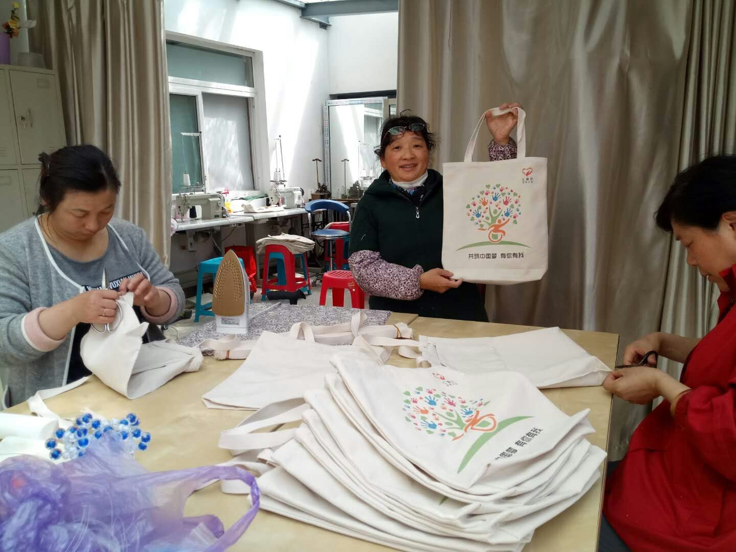 手工布包项目充分调动了残疾人参与的积极性,在前期培训的基础上,残疾朋友深入布包生产的各个环节,贡献自己的智慧和力量。