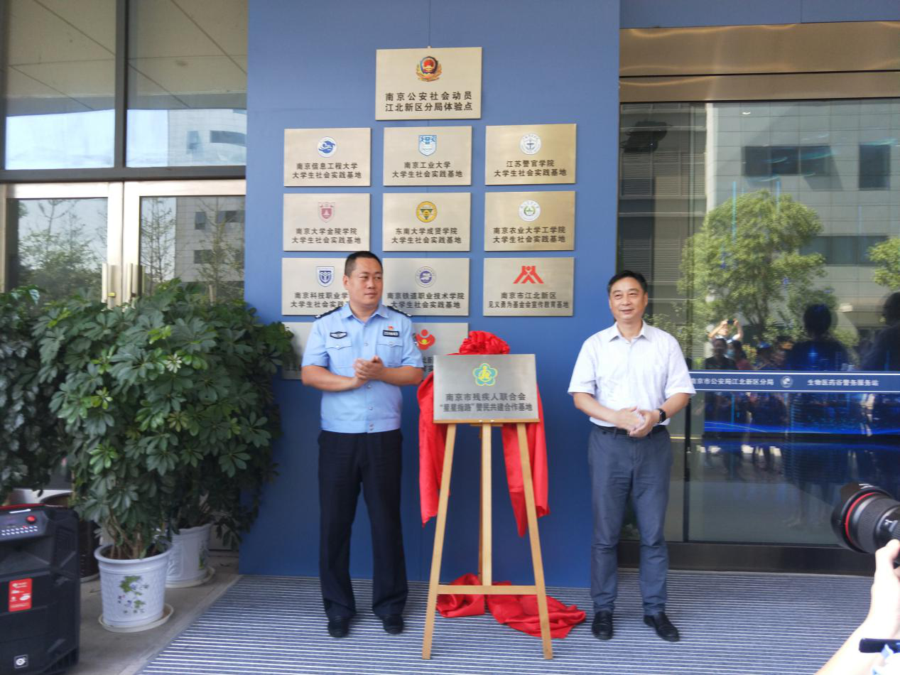 2020年8月1日上午,“星星指路”警民共建合作基地揭牌活动在江北新区“平安N次方”生物医药谷警务体验基地举行。南京市残联党组成员、副理事长任金宝和江北新区公安分局党委委员、纪委书记邵明出席,并为基地揭牌。