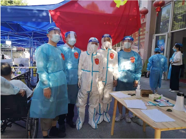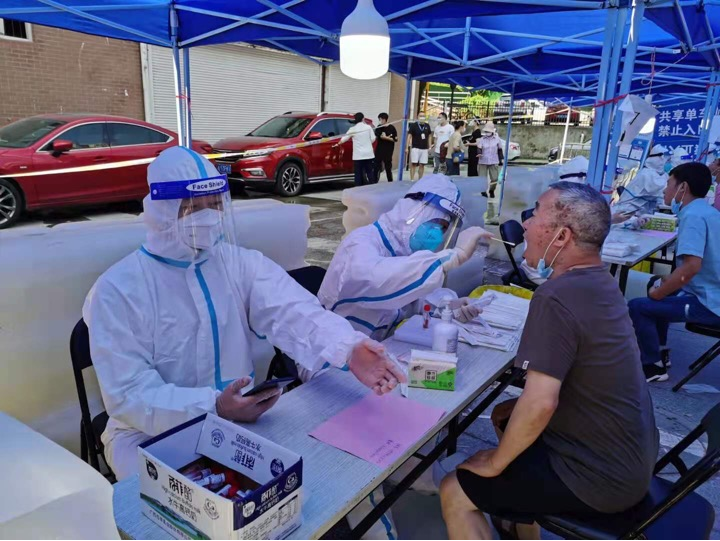 在南京雨花台区铁心桥街道新河社区的5个居民点的核酸检测现场,一个个身穿防护服的市残联党员突击队员正在忙碌着。盛夏的南京,骄阳似火,他们的衣服湿了又干,干了又湿,全身皮肤像长时间在盐水里泡的一样。这已经是他们第6次参与核酸检测服务了。
