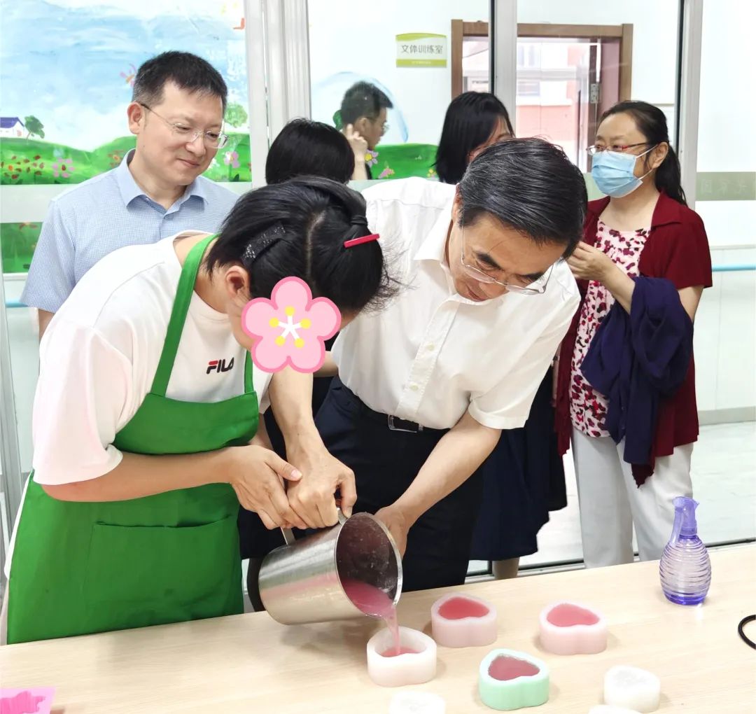 在鼓馨阳光家园,程凯与学员亲切交流,进行互动,体验精油皂制作,对中心辅助性项目纸卷画作品和精油皂赞不绝口。