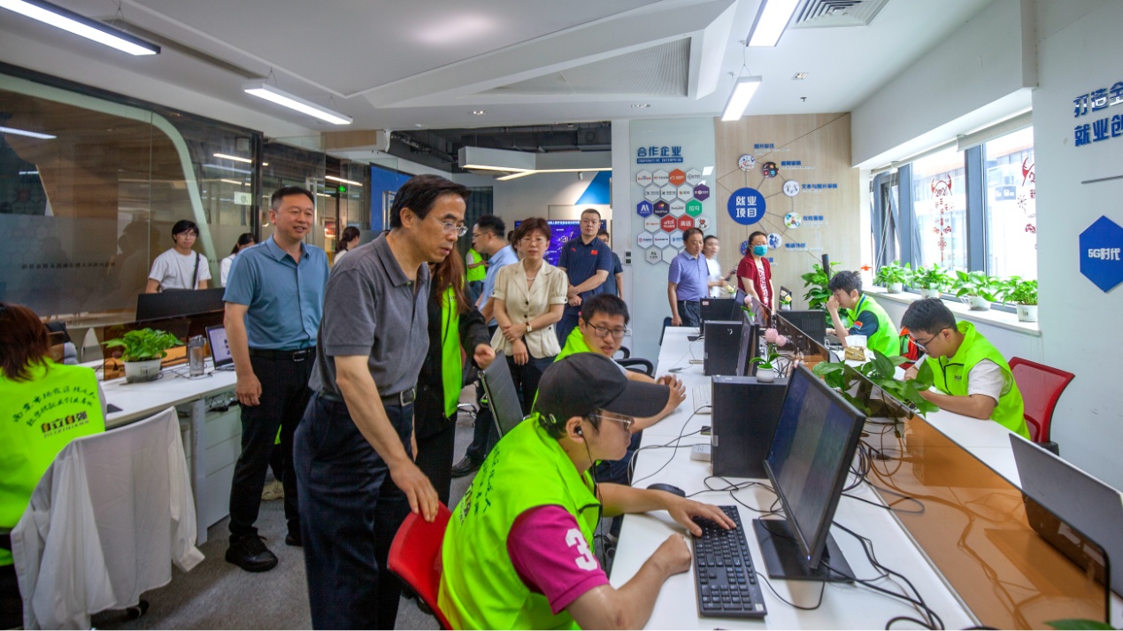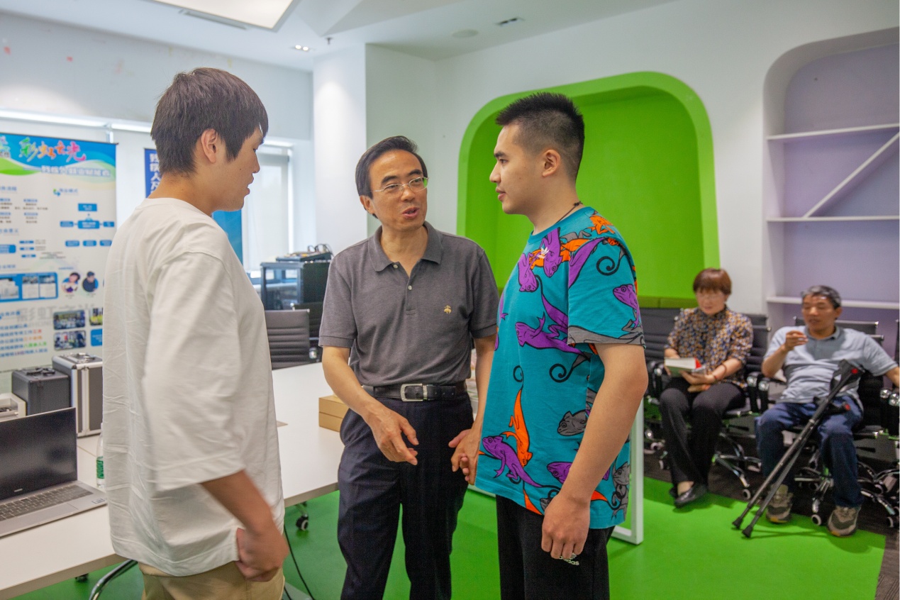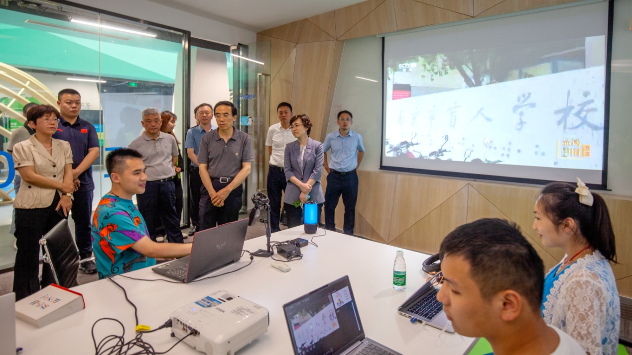 在栖霞区残疾人数字化就业创业基地,程凯与基地孵化的残疾人大学生创业项目“彩虹之光”播客负责人亲切交流,了解项目创办初衷和业务拓展情况,对盲人大学生勇于挑战自我,创新盲人就业新形式,开展有声主播、配音等培训,帮助更多盲人实现就业的做法十分钦佩。