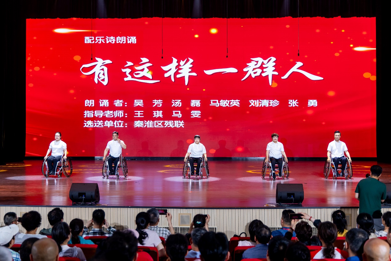 一曲震撼人心的鼓乐表演《锦绣》拉开演出序幕。鼓槌上下翻飞,武术表演苍劲有力,队形伴随着阵阵铿锵鼓声不断变换,让人心潮澎湃。耳边的鼓声落罢,来自秦淮区的几位残疾人又为大家带来了诗朗诵《有这样一群人》,他们饱含深情又慷慨激昂,用一个个故事、一个个人物,歌颂了残友们积极面对生活的励志精神;三人舞《探春》中,表演者的曼妙舞姿带领观众领略春日如诗如画的江南风景。小品《心窗》和《我想叫一声:妈妈》分别讲述了“残疾人之家”和社区康复站与残疾人之间发生的暖心故事;京剧《为残不了情》让观众充分感受到了国粹的魅力;雨花台区新林乐团与6名残疾人乐器表演者共同演奏的《瑶族舞曲》,让观众在时而悠扬时而激情的旋律中,感受瑶族民众欢歌热舞的喜悦;南京市聋校同学们带来的舞蹈《起航》,表达了有志少年在红色精神的感召下,誓言要为中华民族伟大复兴贡献力量……
