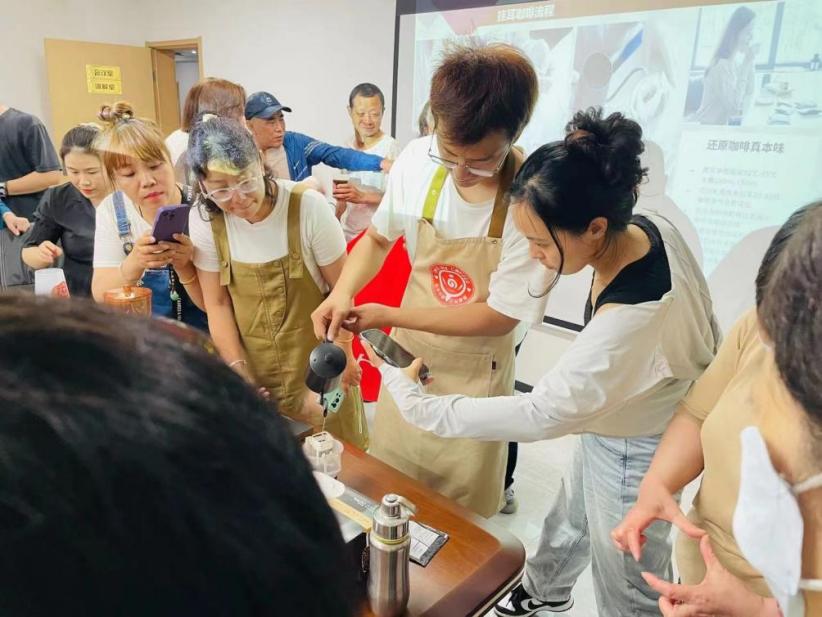 在快节奏的生活里,很多人都想静下来品尝现磨咖啡,因为时间、语言、距离等因素,无法到咖啡店里进行点单。方便大家在家也能随时喝到咖啡店的味道,老师为大家详细讲解了挂耳咖啡的操作方法。大家对老师的耐心制作和讲解都竖起了赞扬的大拇指,纷纷请教。