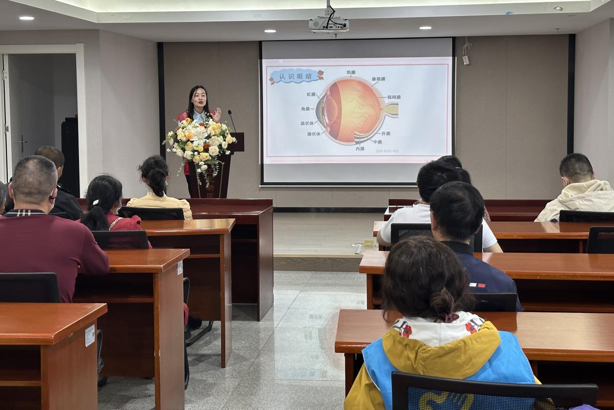 下午时分,南京江北新区公共卫生服务中心医师刘丽双结合爱眼日主题,为现场视障人士和助残志愿者进行了健康科普讲座,她运用通俗易懂的语言、配合生动的案例和直观的演示,从眼部结构、视觉的发育、视觉功能、眼健康问题、近视的发生发展和分类、近视的矫正与防控等方面,为大家普及近视眼预防知识和眼部健康检查的重要性。
