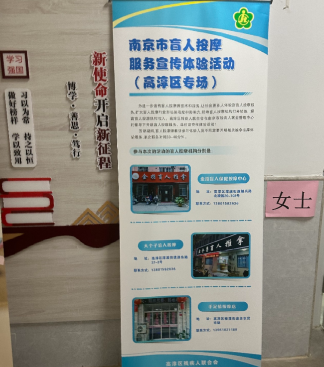 为进一步宣传盲人按摩师技术和服务,让社会更多人体验到盲人按摩服务,扩大盲人按摩行业市场知晓度和影响力,帮助盲人按摩机构打开销路,提高盲人按摩机构收入,促进残疾人就业,高淳区残联在南京市残疾人就业管理中心的指导下开展盲人按摩服务宣传和体验活动!