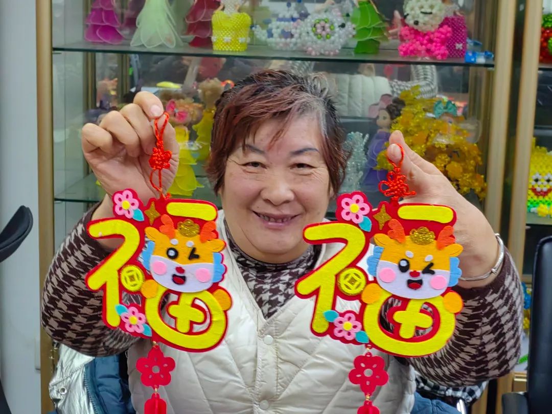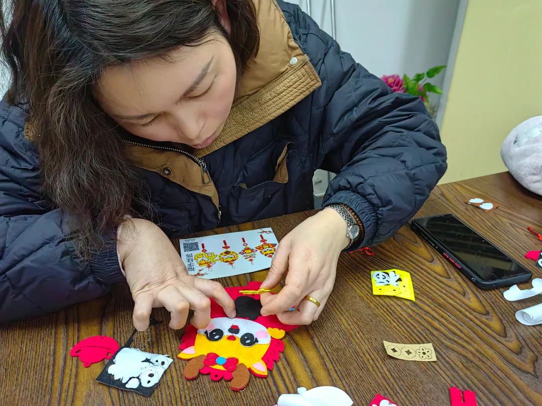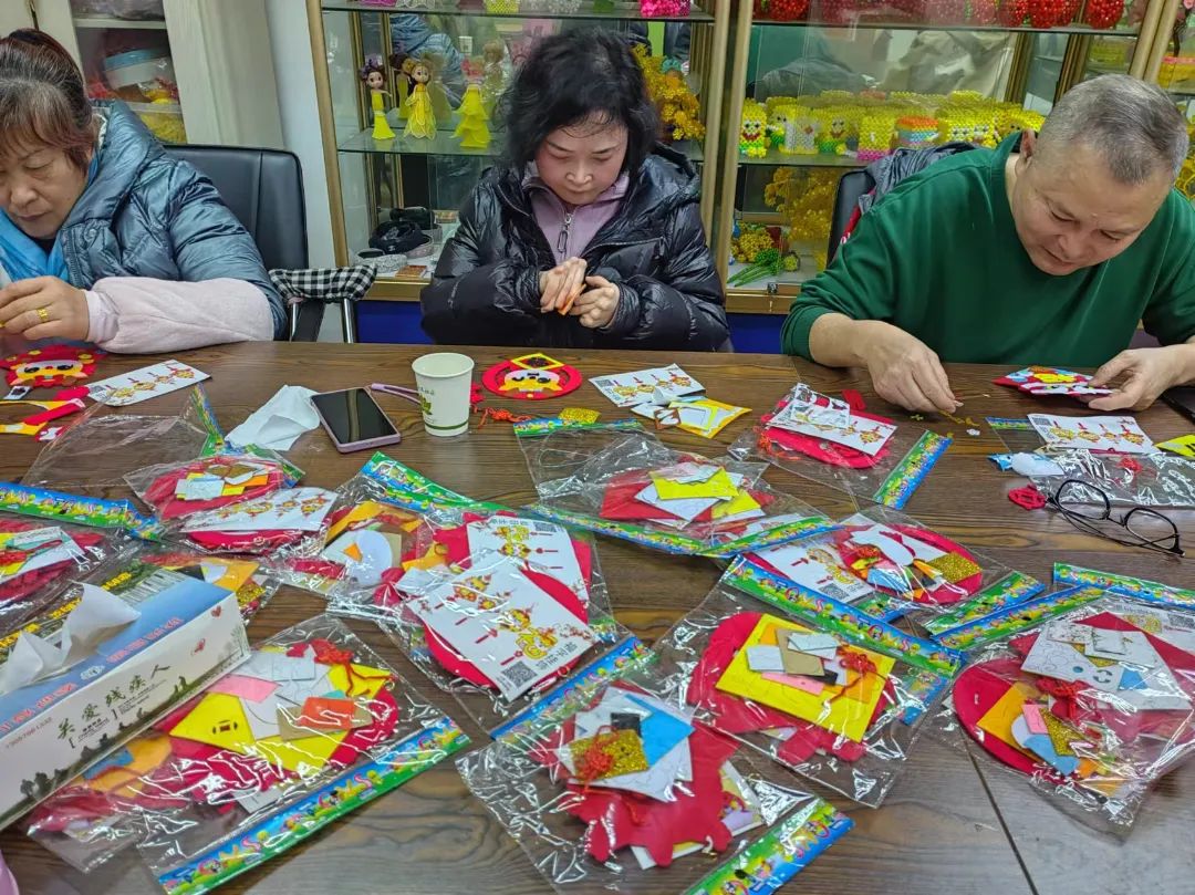 活动从新年主题手工开始,志愿者马老师组织大家制作新年贴画和新春灯笼,用富有创造力的手来装扮自己心目中的新年。老师一边示范一边耐心地介绍着步骤,“把材料包打开,拿出这图案贴上,贴在正确的位置上,再按照图示贴上装饰的贴纸……”,大家跟随着老师的步骤做得很认真,完全沉浸在了手工劳动的乐趣中,不一会儿,一个个充满着吉祥美好寓意的新年贴画就完成了,看着自己手中的成品,大家脸上都洋溢着开心的笑容。比起福袋,灯笼的制作要复杂很多,宫灯形状的灯笼装饰复杂部件众多,残疾人和志愿者几人一组进行合作,各自分工搭档,耐心琢磨,巧思汇聚于巧手,经过一番尝试和不懈努力后,终于成功完成了作品。志愿者将大家制作的新年贴画和灯笼布置起来,残疾人之家一片红红火火,新年喜庆的气氛瞬间拉满!
