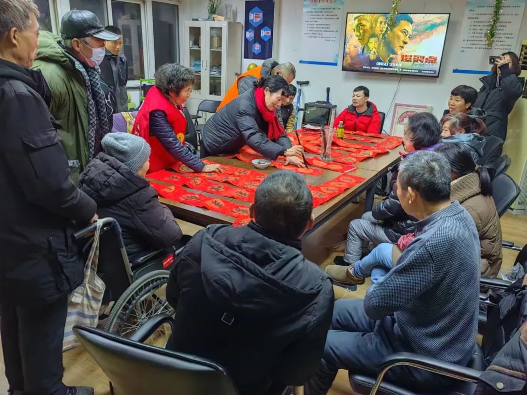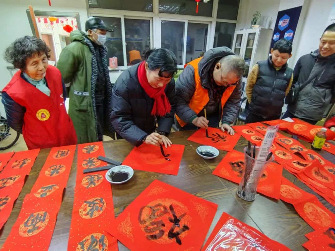“千门万户曈曈日,总把新桃换旧符”。年节里除了贴画和火红的灯笼彰显喜庆热闹的气氛,其次就要数“福”字和春联了,纸墨齐备,志愿者为大家挥毫泼墨,一笔一画中寄托了辞旧迎新、接福纳祥的美好愿望,活动现场温馨和谐,大家展开歌喉,歌唱越来越好的生活,歌唱充满期待的明天。