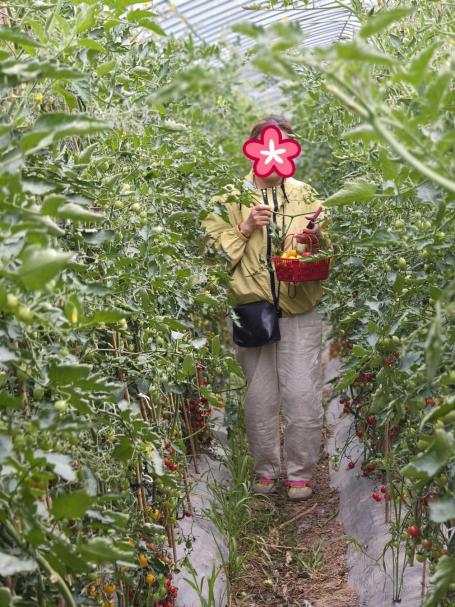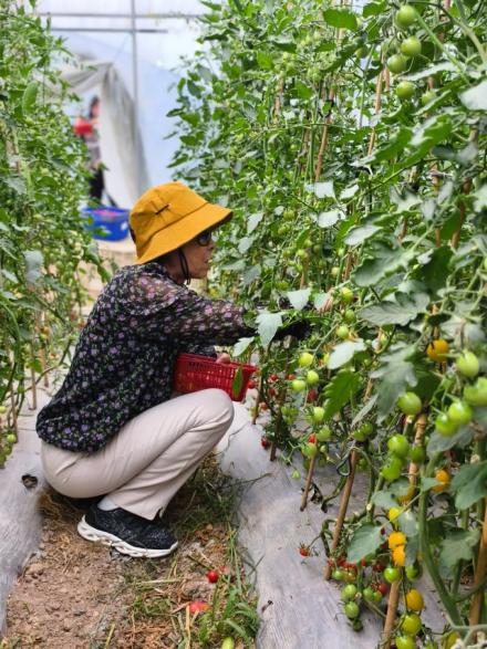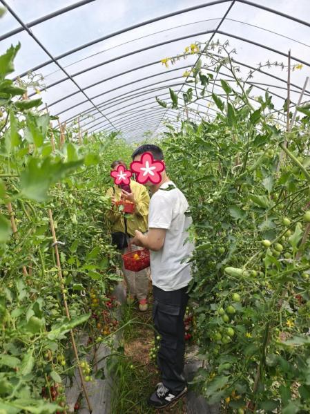 采摘园内残疾人朋友们首次体验了“多彩小番茄科技采摘区”,该区域通过物联网技术精准调控温湿度与光照的智能种植系统,培育出红、黄、绿三色小番茄。残疾人朋友们体验运用“一扭一转”的采摘技巧,亲手收获生态种植的丰硕果实。