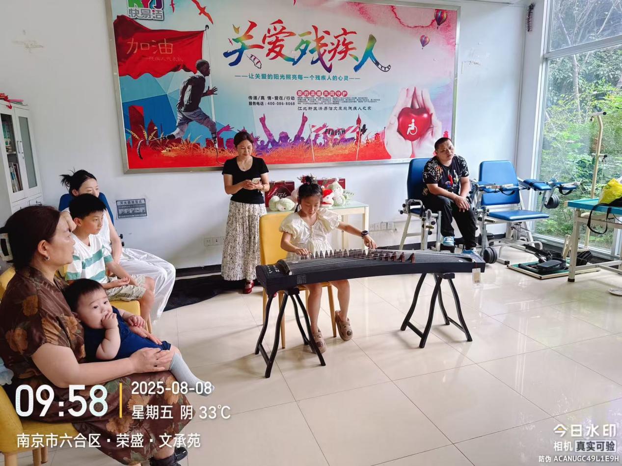 活动一开始,孩子们便用最纯粹的方式传递着关爱,送上亲手绘制的画作,带着孩子气的真挚,没有复杂的修饰,却是满满都是对残疾人的善意,仿佛在说“你们值得被好好对待”,让看到的人感受到那份不掺杂质的温柔与尊重。古筝独奏的响起,活动氛围推向高潮。小姑娘专注的神情、娴熟的技艺令人动容,悠扬的琴声在室内回荡,现场仿佛被一种宁静而美好的力量笼罩,大家纷纷起身记录下这动人瞬间,生怕惊扰了这份和谐。曲终之时,掌声雷动,在众人的热情鼓励下,这位小小演奏家再次登场,自信地做起自我介绍:“我学古筝五年了,从四岁开始坚持到现在。”这份日复一日的刻苦与坚持,深深感染了残疾人之家的每一位成员,让他们看到了“不放弃”的力量,更坚定了对生活的信心。