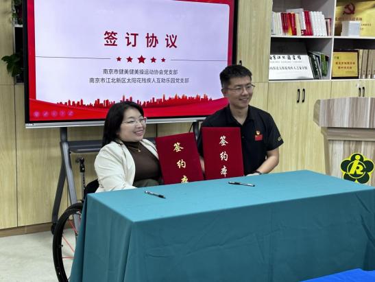 活动伊始,双方党支部隆重举行了共建签约仪式。江北新区太阳花残疾人互助乐园党支部书记朱军林与南京市健美健美操运动协会党支部书记高翔共同签署协议,此举标志着两个基层党组织将建立长期、稳定的协作关系。此举旨在强化党建引领,通过资源共享与活动联动,将专业的体育资源引入助残服务,共同探索“党建+公益”的深度融合模式,为持续关爱残障群体筑牢组织根基。