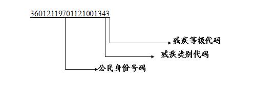 第五条 残疾人证号以公民身份号码和残疾类别、残疾等级代码为基础,实行全国统一编码,编码格式一律实行20位编码,由18位公民身份号码加1位残疾类别代码和1位残疾等级代码组成,如: