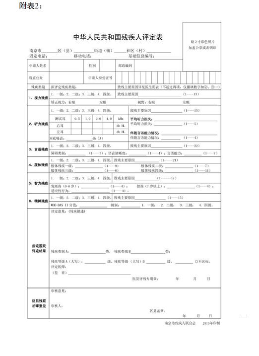 第十三条 申办残疾人证须使用全市统一的《中华人民共和国残疾人证申请表》(以下简称“申请表”,见附表1)《中华人民共和国残疾评定表》(以下简称“评定表”,见附表2)。通过“南京市残疾人基础信息管理系统”,管理残疾人证发放工作。